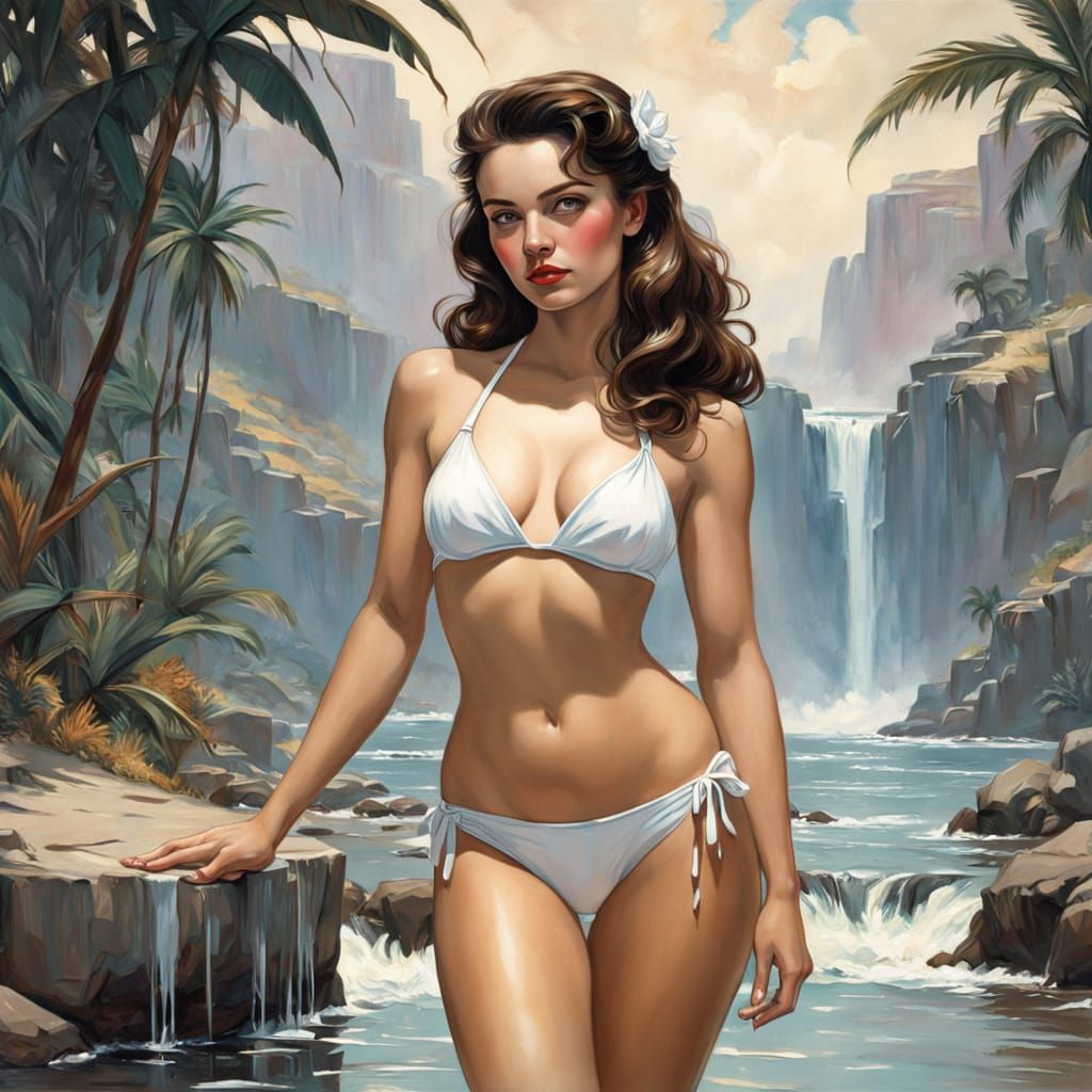 A striking picture of a 1950s-style pin-up girl in a white bikini. This full-body shot showcases idealized naturalism with soft focus and a harmonious color scheme, reminiscent of classic oil paintings.