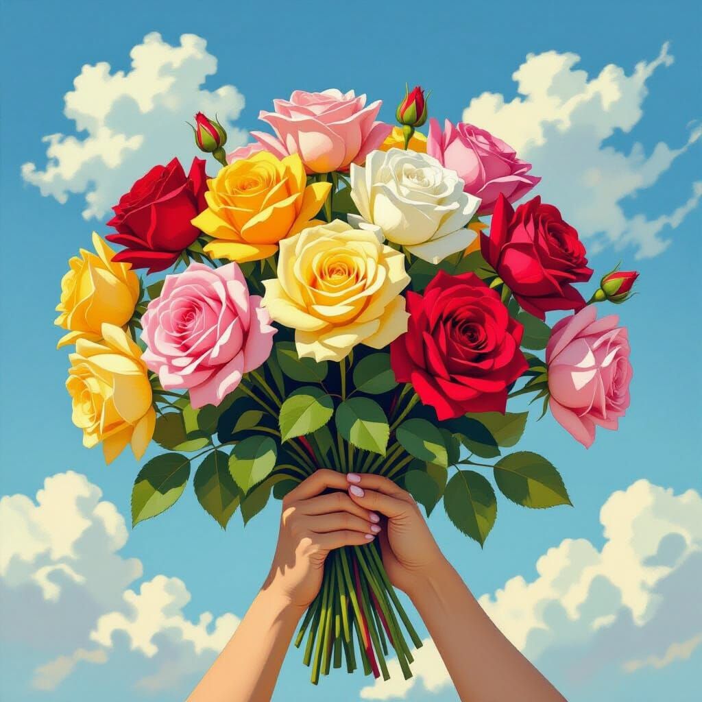 A digital image of a woman holding colorful roses against a blue sky. The artwork evokes art nouveau aesthetics, with bold brushstrokes and detailed petal work.