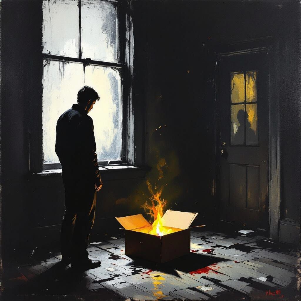 This dramatic oil painting shows a man reading an open message in a box inside a dark, abandoned house at night. Chiaroscuro lighting and a desaturated palette enhance the foreboding atmosphere.