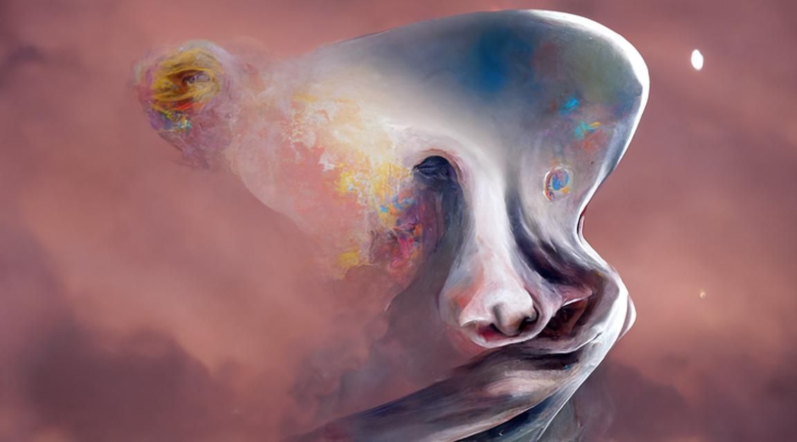 This surreal portrait features a cracked porcelain figure with a black hole for a face against a starry cosmic background, glowing with opalescent iridescence. It evokes themes of loneliness and the surreal.