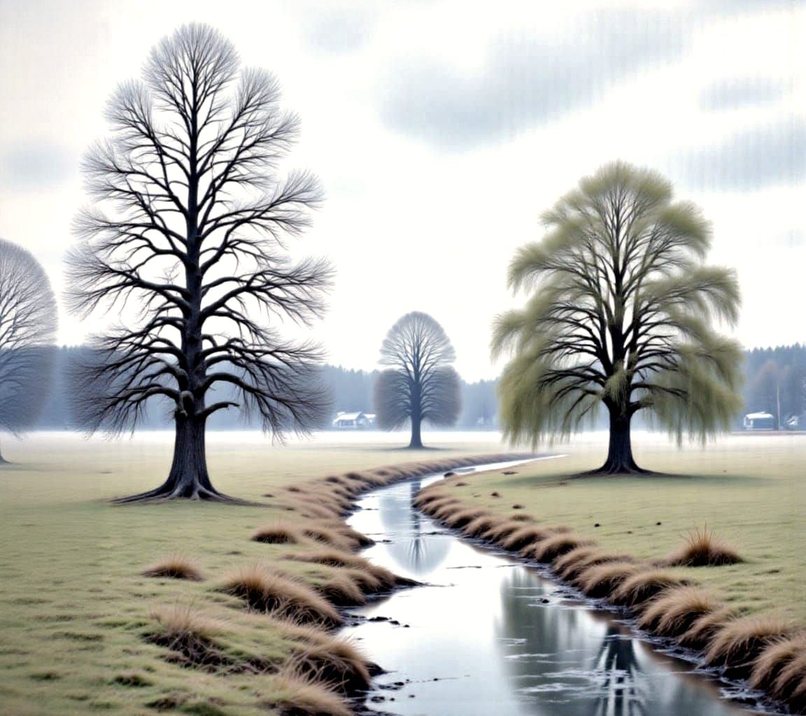This image shows a tranquil, overcast landscape featuring a weeping willow, a meandering stream, and skeletal trees under a muted gray sky. The scene is rendered with muted greens, browns, and grays.
