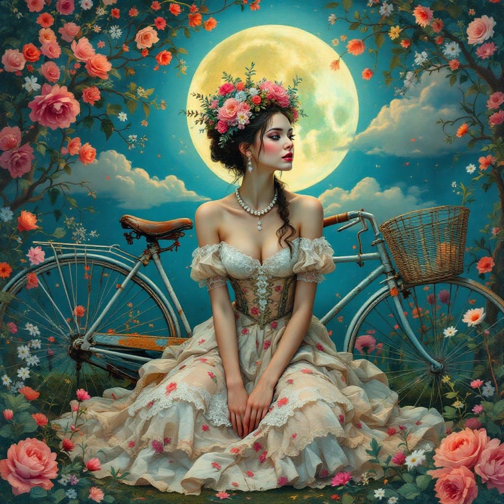 This image features a whimsical woman sitting amidst lush florals, surrounded by the elegance of Renaissance attire, with a broken bicycle and a radiant moon, in a dreamlike style that blends Surrealism and Renaissance flair.