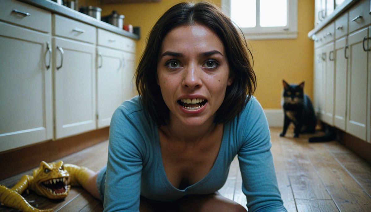 A terrifying image of a woman frozen in fear on a kitchen floor. Human teeth litter the floor around her as a creature with glowing eyes looms in the background in a fauvism style.