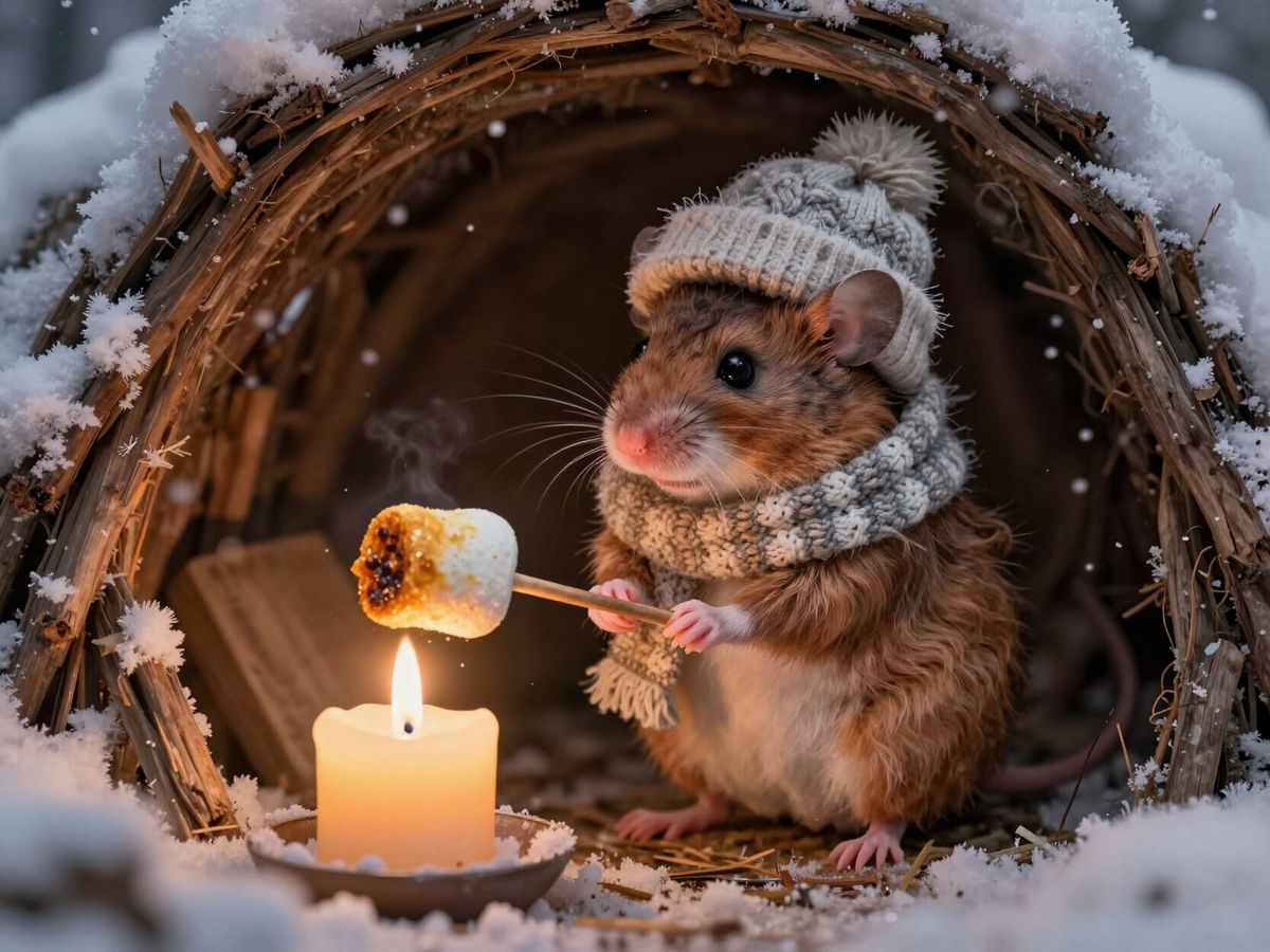 This photorealistic image shows a small, adorable mouse in a stocking hat roasting a large marshmallow over a candle in a rustic, snow-dusted burrow. The scene is warm and inviting.