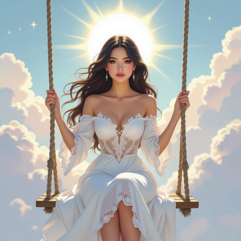 A serene woman with dark hair in a white dress swings among clouds. Rendered in a dreamlike watercolor gouache style with ethereal lighting and sun flare.