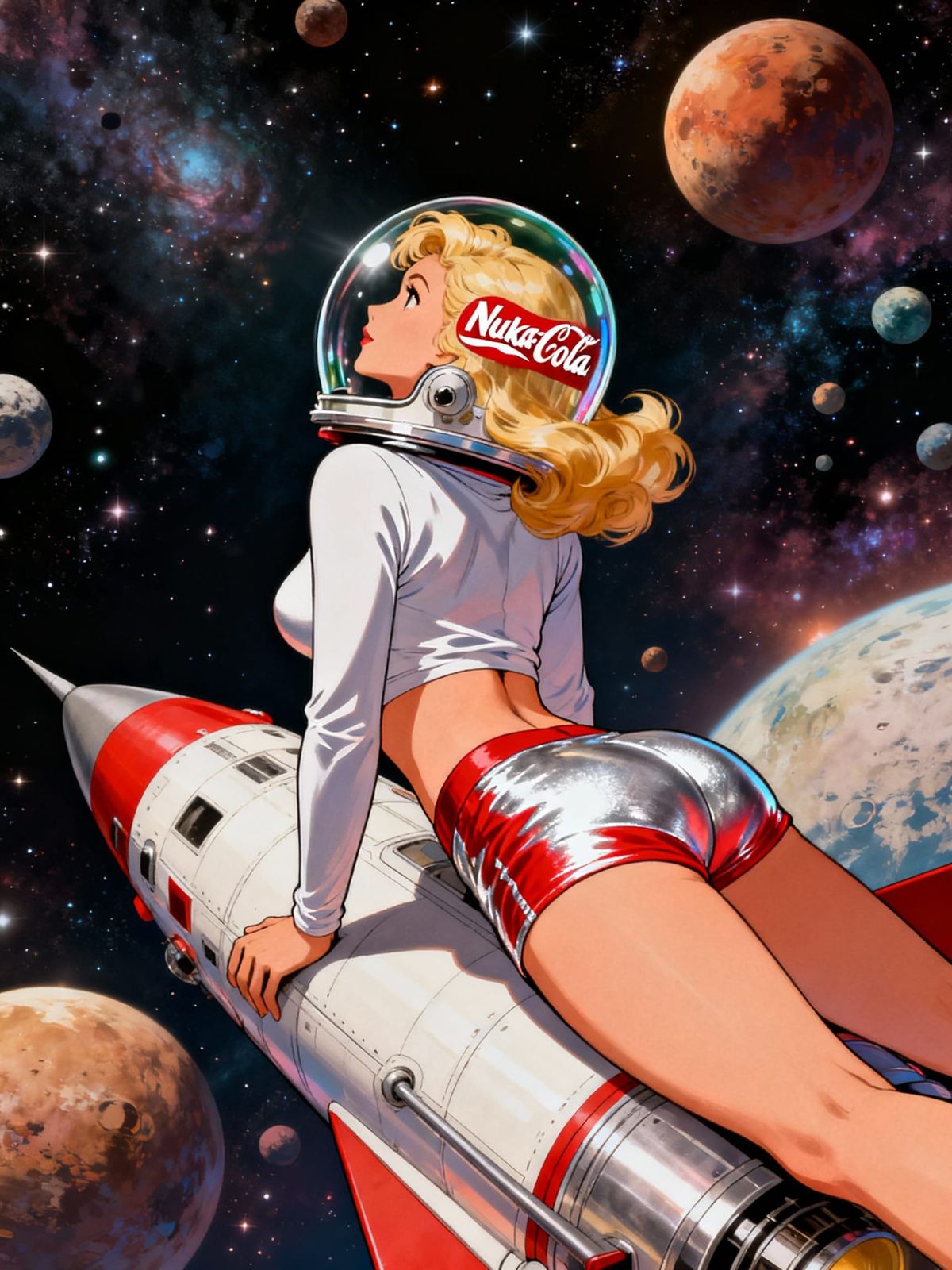 This image shows a blonde woman posing on a rocket with a Nuka-Cola helmet, set against a cosmic background. Rendered in a colorful manga style, it captures a pin-up aesthetic.