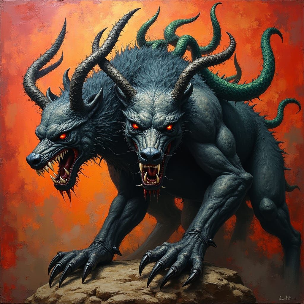 A textured painting of Cerberus, the fearsome three-headed hellhound of Greek mythology, with black fur, a serpent's tail, and snakes growing from its back. This striking image showcases neo-impressionism and expressionist styles.