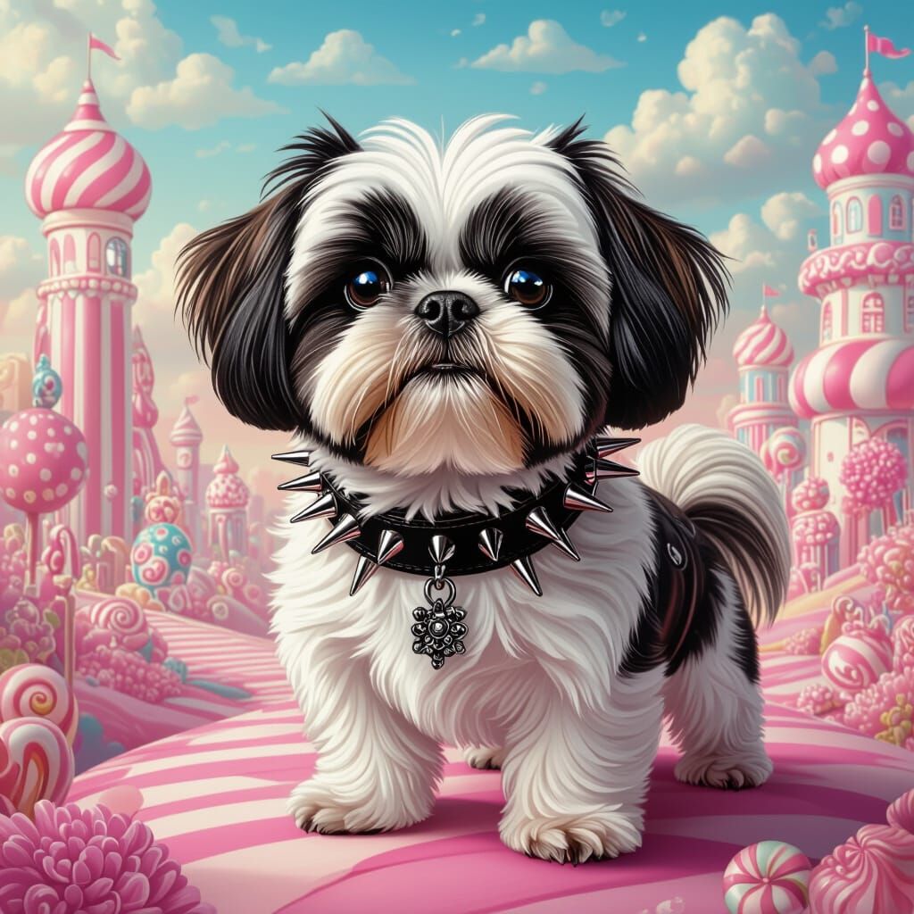 A striking picture of a shih tzu wearing gothic accessories in a brightly colored candy land. The image has a surreal, whimsical aesthetic with dark romantic and pastel elements.
