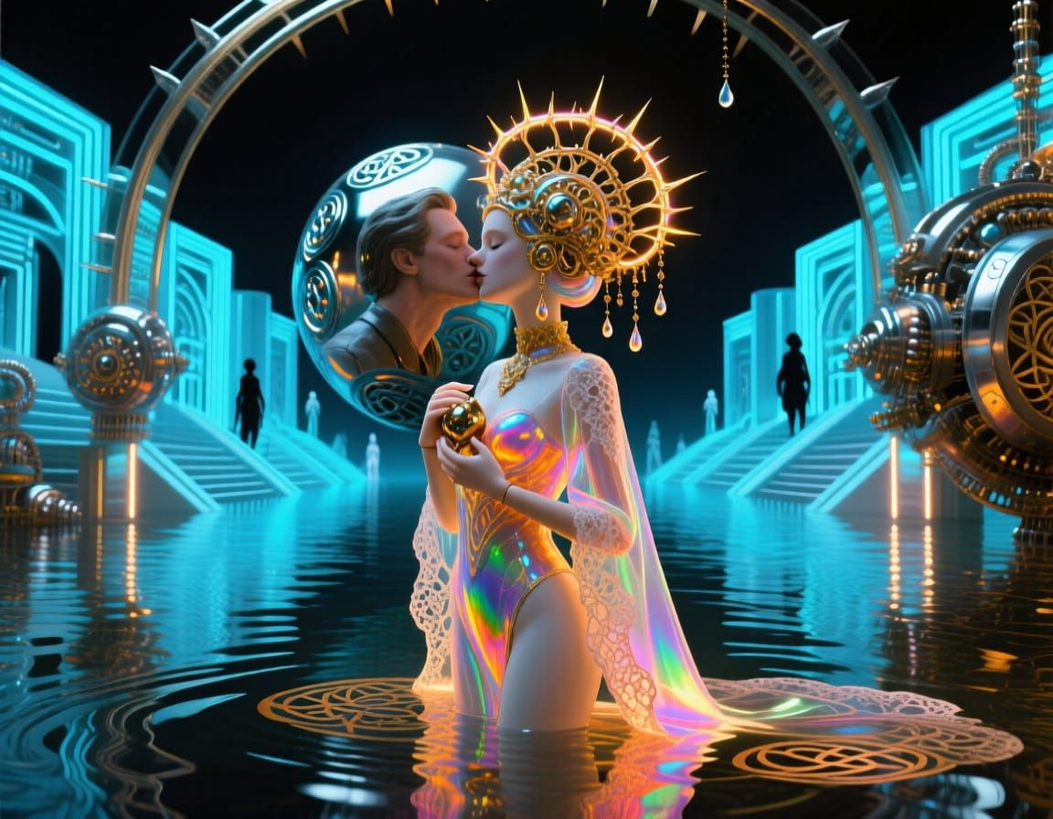 living man image in a framed painting and woman doll outside the painting kissing by glass artist "gilded tenebrism" art deco style living paradigm marbleous afterglow the overall effect is a stunning, 3D chiaroscuro a futuristic fantasy scene with a surreal atmosphere. In the foreground, a masterpiece ...