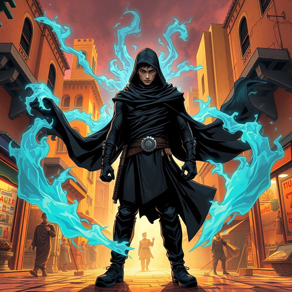 A comic book art piece of Solo Leveler, Sung Jin-Woo, standing proudly in the bustling streets of Marrakech, Morocco, surrounded by ancient architecture and markets, with a dark, otherworldly aura.