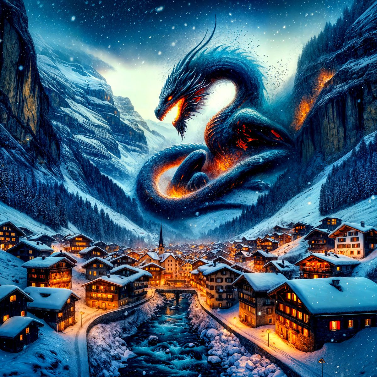 This hyperrealistic image depicts a secluded Swiss Alps village in a snow-covered valley, with a large dragon coiled around a mountain peak. Warm lights glow from the houses.