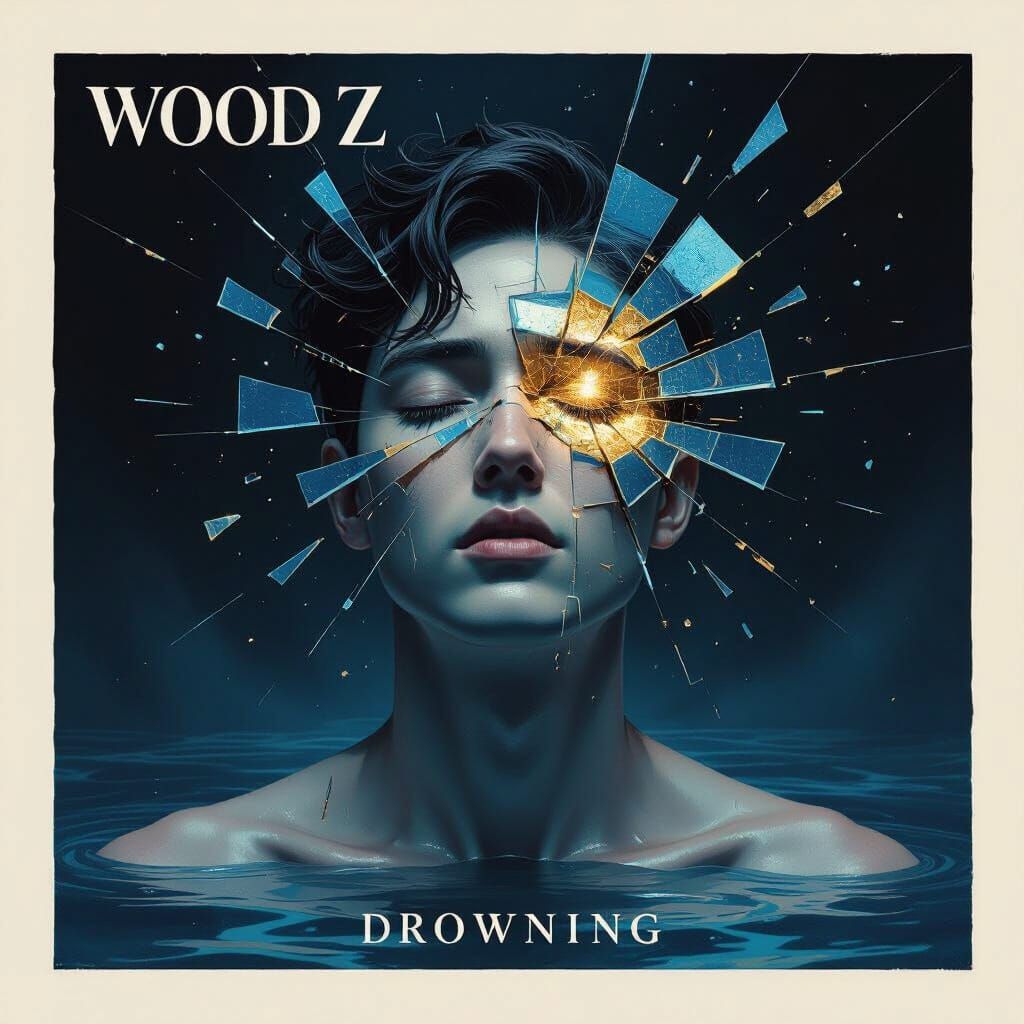 This image depicts a human figure's face breaking into blue and gold fragments, evoking emotional collapse. The scene features dramatic lighting and a painterly texture inspired by master artists.