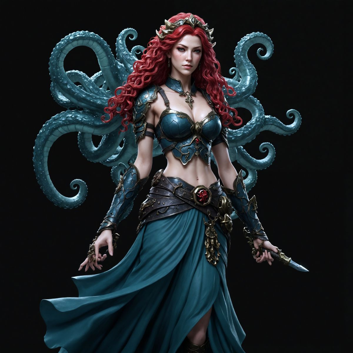 A mystical underwater priestess with flowing red hair in the form of an octopus, surrounded by the essence of the sea. This enchanting scene combines mythological and aquatic elements in a dreamlike setting.