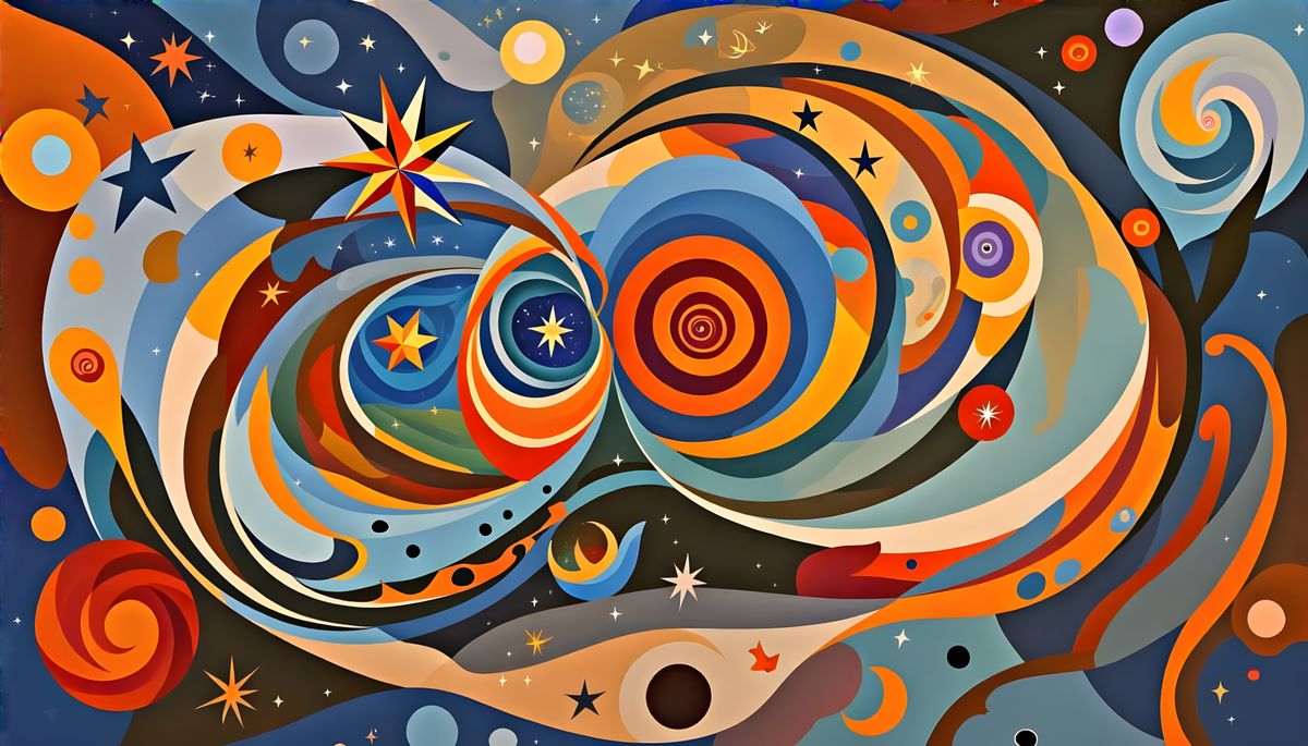 This ethereal image depicts vast cosmic vortexes and swirling plasma coils, with uniquely designed symbolic stars. Rendered in a dreamlike, luminous abstract style.