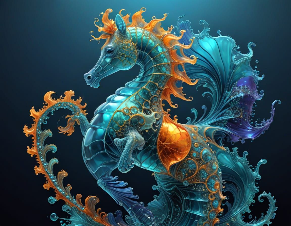 This image shows a woman riding a seahorse. The art style combines vibrant colors with abstract fractal elements, 3D shading, and goldenpunk filigree to create a visually striking scene.