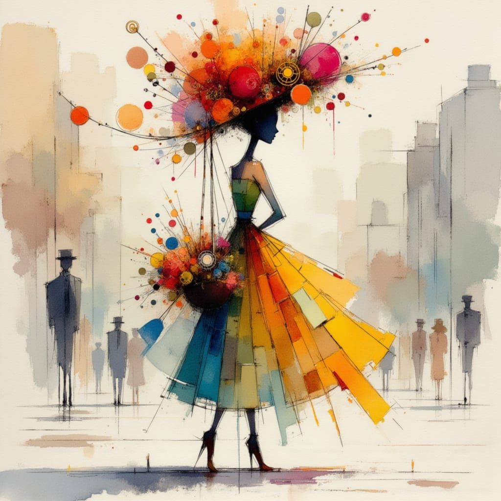 This image shows a flower seller with a fantastical hairstyle on a London street. The artwork features intricate details, vibrant color accents, and a steampunk aesthetic.