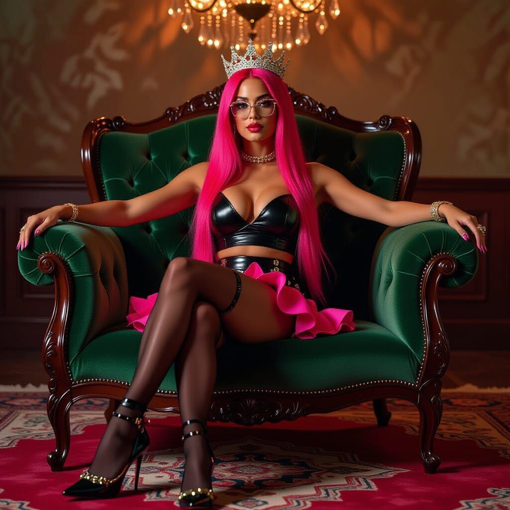 This image shows a Latina woman with neon pink hair confidently posed on a green velvet chaise lounge. The luxurious setting and her bold outfit are captured as high-end 4K film.