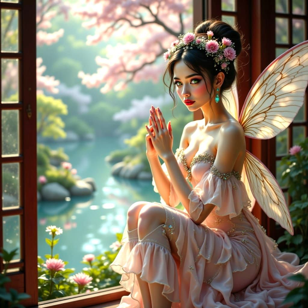 This image features a serene geisha fairy standing beside a tranquil Japanese temple, surrounded by lush gardens, cherry blossoms, and a serene lake. The fairy's delicate skin, fine features, and captivating turquoise eyes convey a gentle, enigmatic expression, evoking the soft, dreamy quality of Impress...