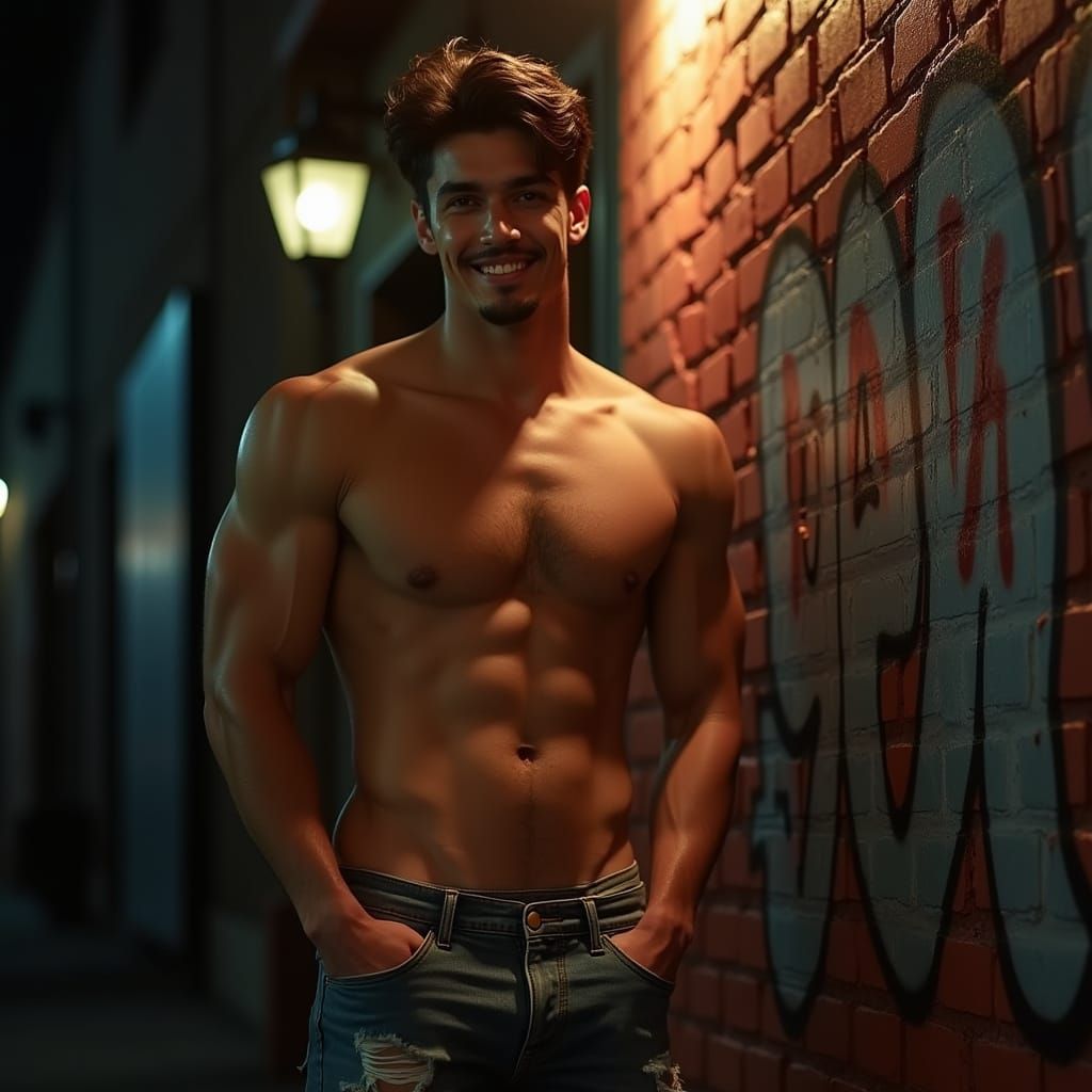This image shows a handsome Latino college jock smiling in the warm glow of a streetlight. Shirtless and wearing torn jeans, he leans against a graffiti-covered brick wall.