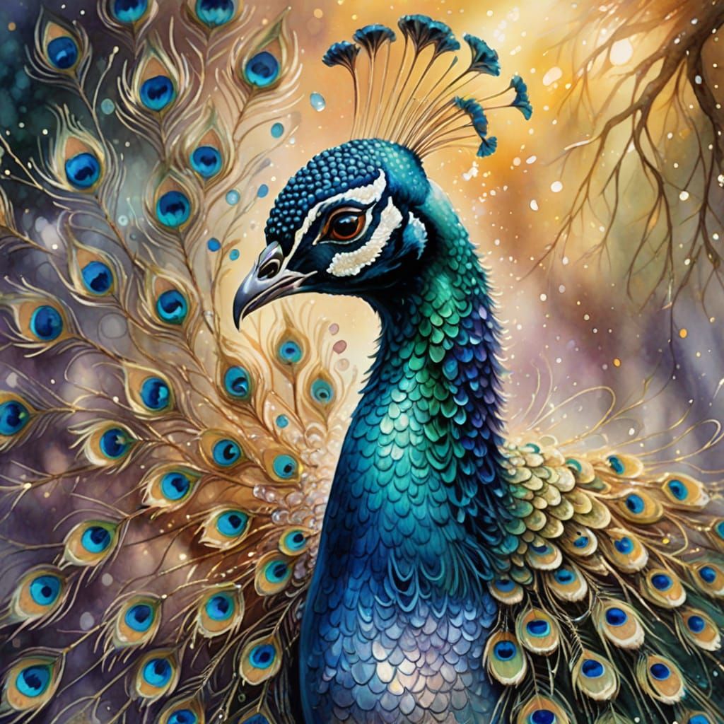 A delicate, dreamy watercolor peacock shines with iridescent colors and misty feathers in a warm, golden light, reminiscent of Thomas Kinkade's signature style.