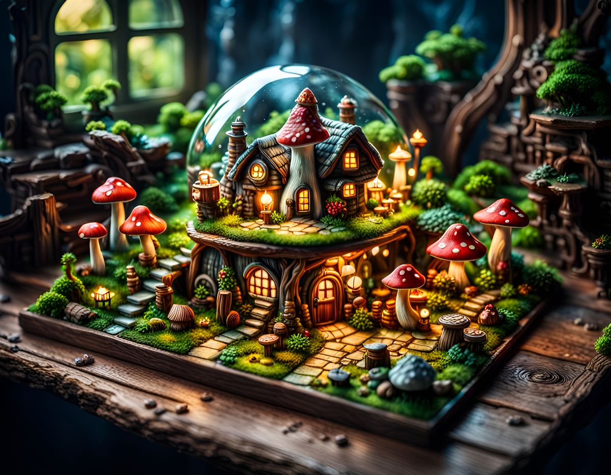 A wonderful fantasy mushroom village miniaturized terrarium inside a board game box, Epic cinematic brilliant stunning intricate meticulously detailed, epic atmosphere, maximalist digital matte painting, intricate details, HDR, beautifully shot, hyperrealistic, sharp focus, 64 megapixels, perfect composition, ...