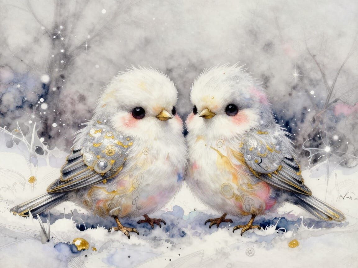 This image showcases two fluffy watercolor birds huddled together in a winter snowfall. The artwork features a vibrant, glitchy punk aesthetic with intricate details and soft pastel colors, reminiscent of melted oils.