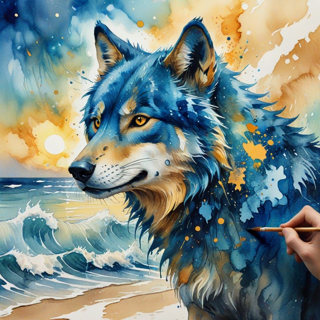This image shows an artist painting a blue wolf by the sea. The watercolor art style features vibrant colors, expressive brushstrokes, and a dreamy, whimsical atmosphere with golden lighting.