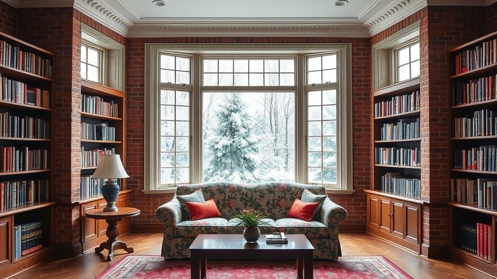 This image shows a Victorian-style library featuring floor-to-ceiling bookcases flanking a bay window. A floral sofa and coffee table sit in front of the window, which offers a view of snow-covered pine trees.