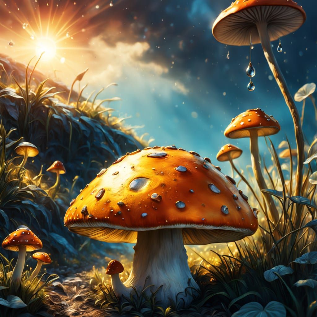 This enchanting image showcases a gigantic, bright orange mushroom with intricate polka dots and a tall, textured stem, set amidst a mystical atmosphere of warm sunset colors and soft, golden lighting.
