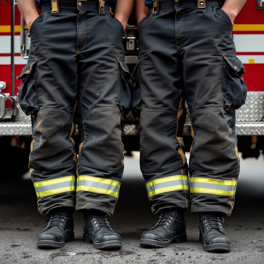 This image captures two firefighters relaxing against their truck, highlighting the details of their worn gear and the texture of their black socks in a photorealistic style.