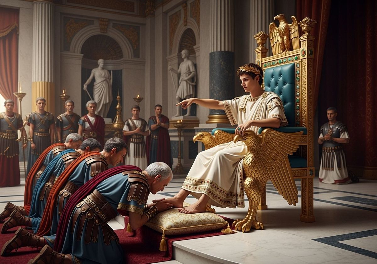 This image shows Emperor Nero on his throne in an Ancient Rome palace. A Roman senator kneels before him, swearing loyalty. The emperor wears a white toga embroidered in gold and emeralds.