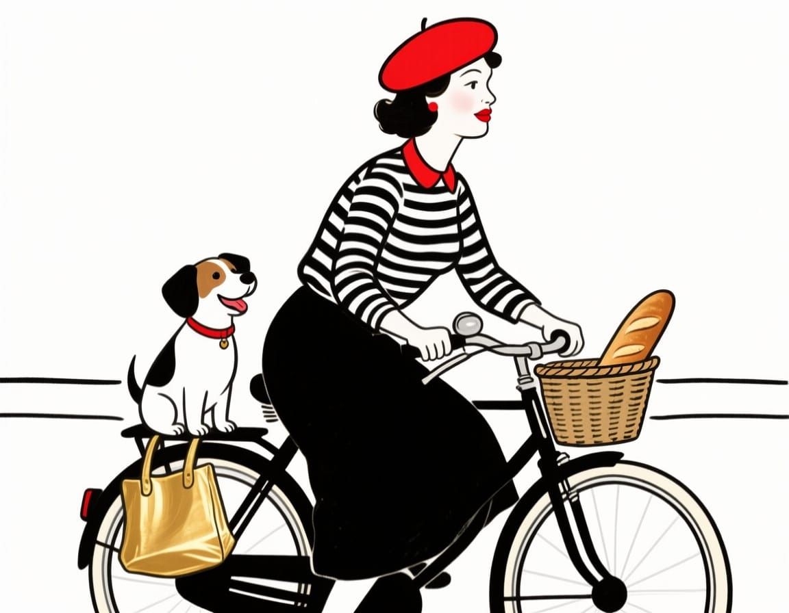 This image shows a French woman with a beret and baguette riding a vintage bicycle with her dog. The illustration features bold lines and a limited color palette, designed in a minimalist style.