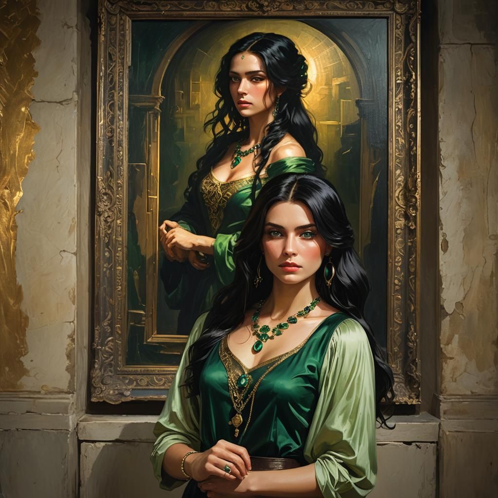 A captivating image of a woman discovering a secret compartment within an antique painting in a dimly lit museum. This matte painting features warm golden tones and intricate textures, creating a mystical ambiance.