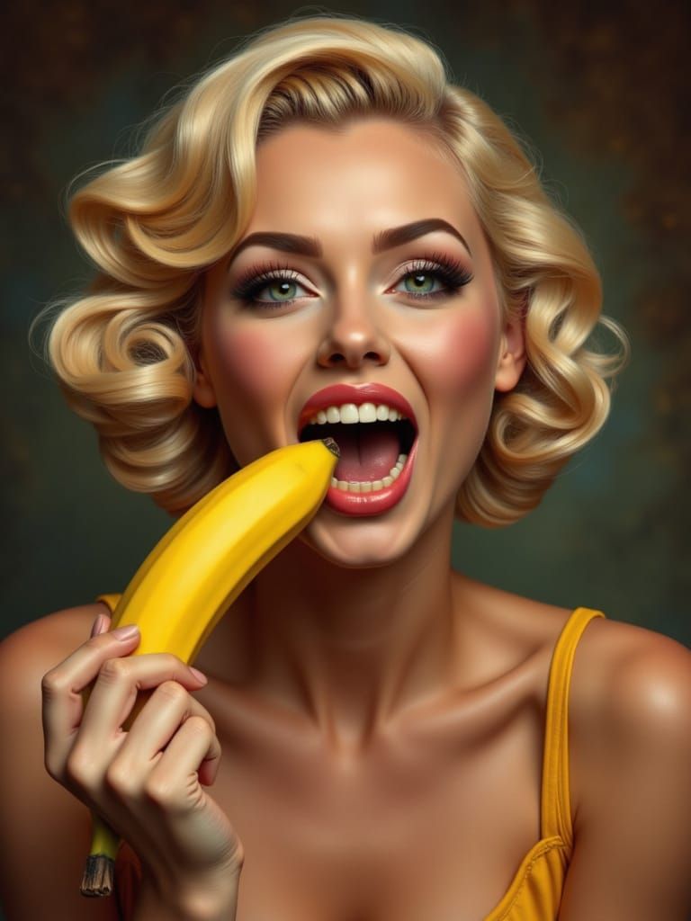 This image shows a realistic pin up woman with blonde hair playfully biting a screaming banana. The artwork features deep colors and flickering lights, creating a detailed, animated feel.