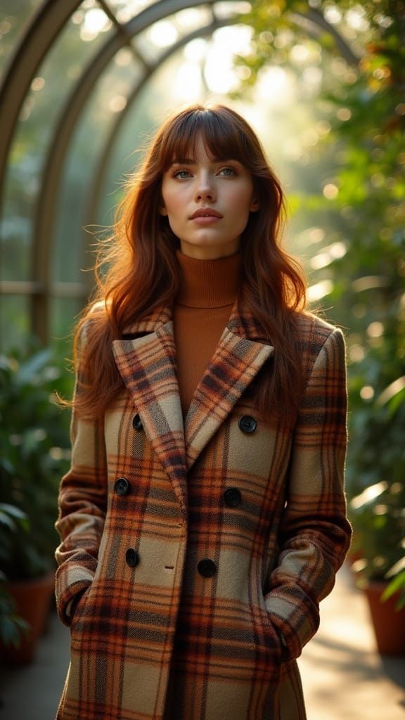 This image showcases a stunning young woman standing confidently in a modern conservatory tunnel, bathed in warm golden light. Her porcelain skin and chestnut hair are beautifully framed, while her bold double-breasted coat adds a touch of luxury and sophistication.