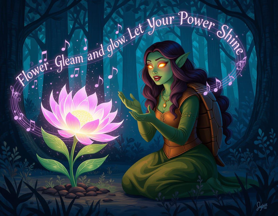 A digital painting depicts an evil turtle villainess with glowing eyes kneeling in a dark forest. She sings to a radiant flower surrounded by swirling music notes, in a detailed and elegant style.