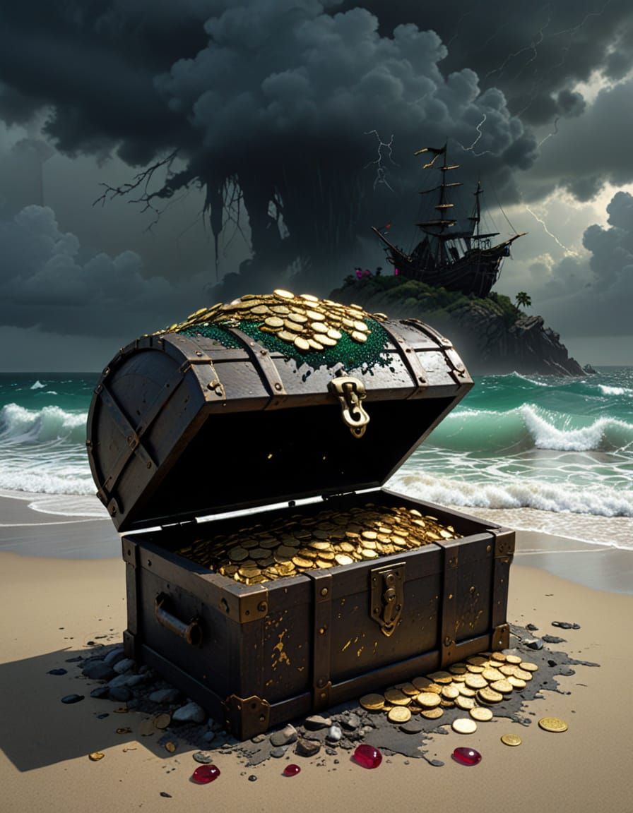 A striking picture of an open pirate's treasure chest filled with gold coins and jewels on a deserted beach. This image showcases an ink drip style with a moody, vintage charcoal sketch aesthetic.