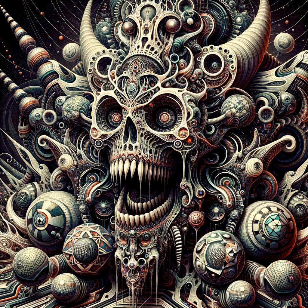 This image features dark, bizarre, and scary detailed imagery with complex impossible structures and macabre creatures in an uncanny, psychedelic style inspired by early surrealism.