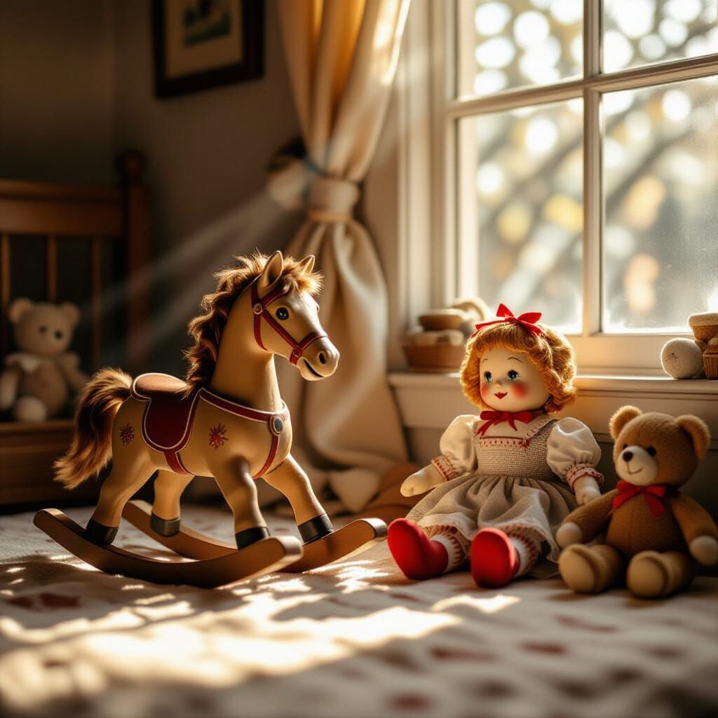 This image showcases a vintage nursery filled with classic antique toys like a wooden rocking horse and Raggedy Ann dolls. Soft, warm light creates a nostalgic and innocent atmosphere with gentle shadows and illuminated dust motes.