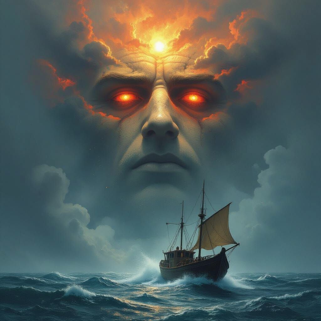 A surreal image of an angry face in the sky blowing wind and leaves. The face has fiery red eyes and the background shows a stormy sea with a shipwreck in a dark fantasy style.