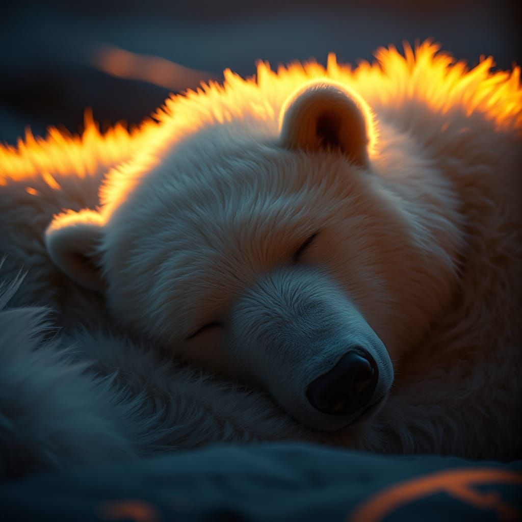 This cinematic image captures a serene, fluffy white bear sleeping peacefully, surrounded by a soft, golden light, with richly graded colors evoking a sense of nostalgia and wonder.