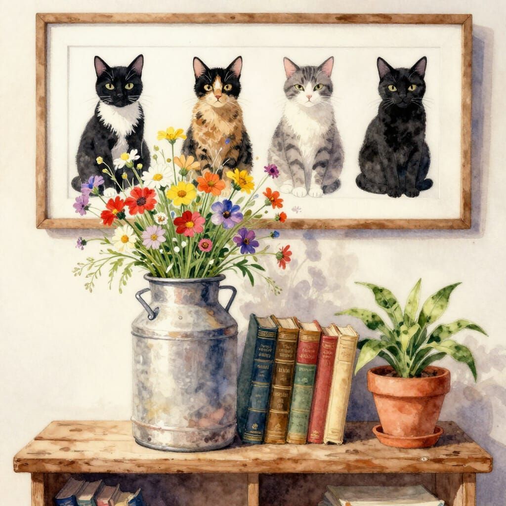 This image showcases a watercolor painting featuring a milk jug filled with wildflowers on a wooden bookshelf. Antique books, a plant, and a framed portrait of four cats complete the scene, bathed in warm light.