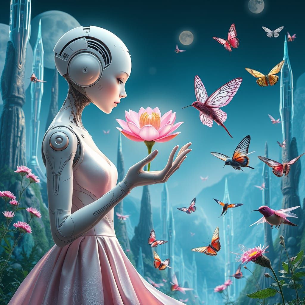 This image depicts a serene, otherworldly scene of an android woman tenderly offering a cybernetic flower to a mystical faun amidst a gathering of iridescent, cybernetic creatures in a lush, futuristic oasis, evoking a sense of wonder and enchantment.