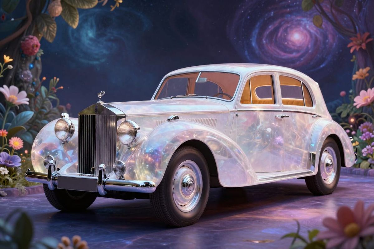 This image showcases a hyper-detailed 1938 Rolls Royce Wraith with a unique crystalline finish, parked under a magical cosmic sky filled with flowers and leaves. Rendered in a Disney fantasy art style with dynamic lighting.