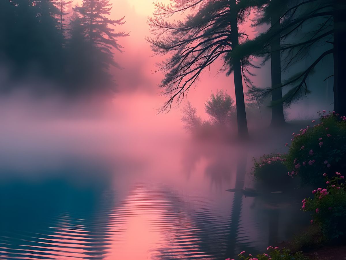 This image captures a serene blue lake shrouded in a mystical pink fog, surrounded by lush flowers, bushes, and trees. The scene exudes an otherworldly atmosphere, with intricate details and a cinematic feel.