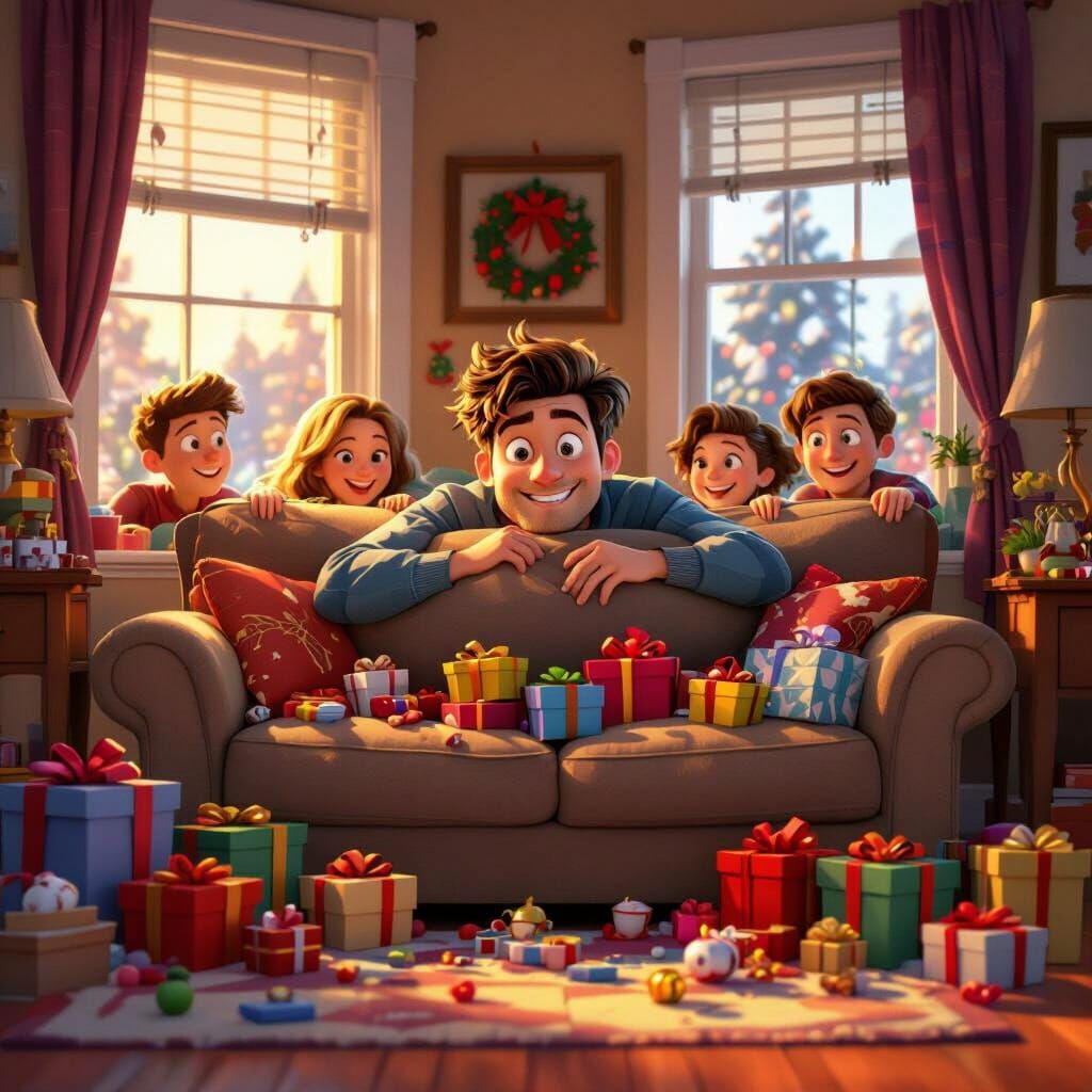 This image shows a young man hiding during a surprise party. Friends peek through the windows as his mom smiles amid a mountain of gifts. The scene is rendered as colorful 3D art.