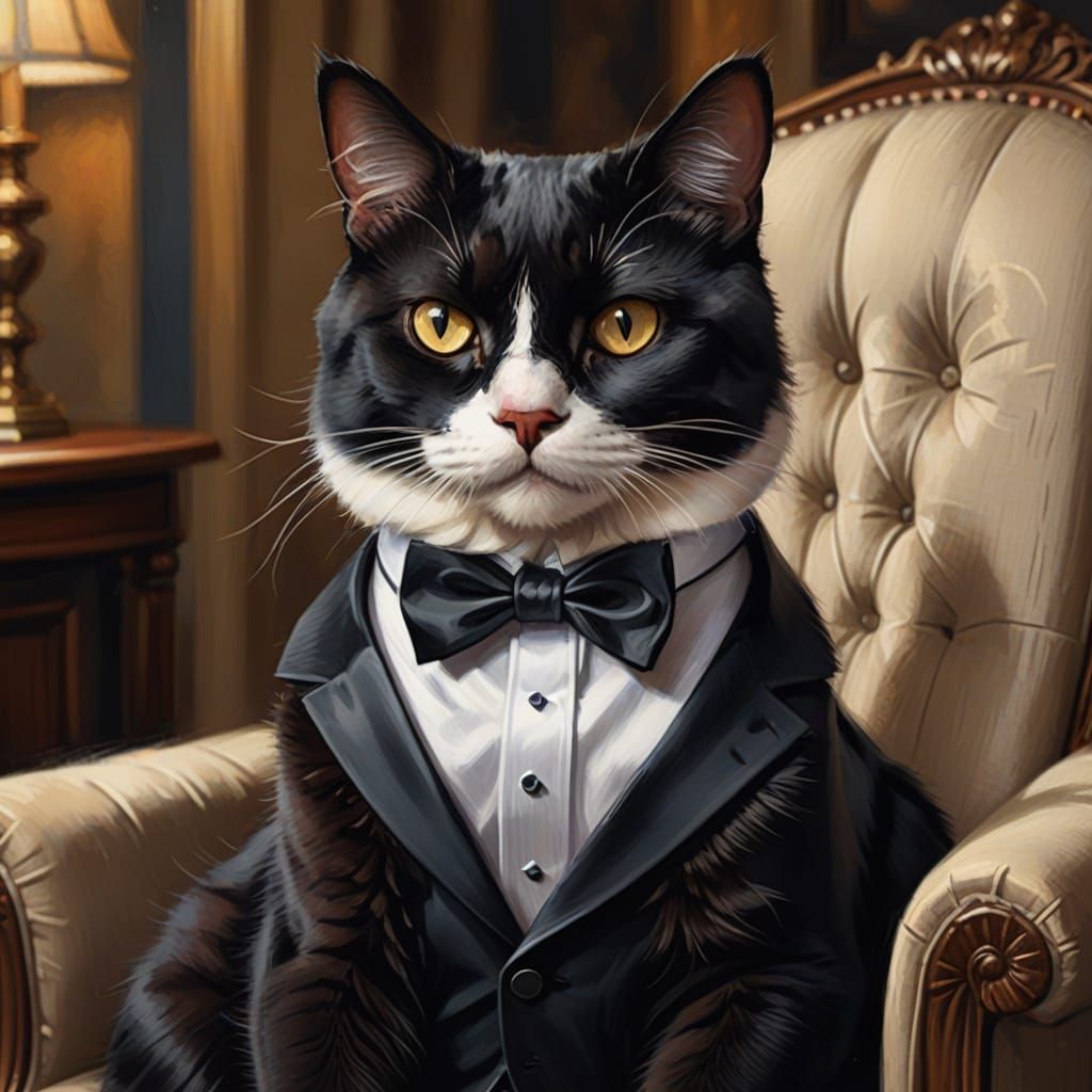 A digital painting of a tuxedo cat in a tuxedo, seated in a chair. This portrait showcases detailed textures and soft, warm lighting, capturing a humorous and whimsical feline character.