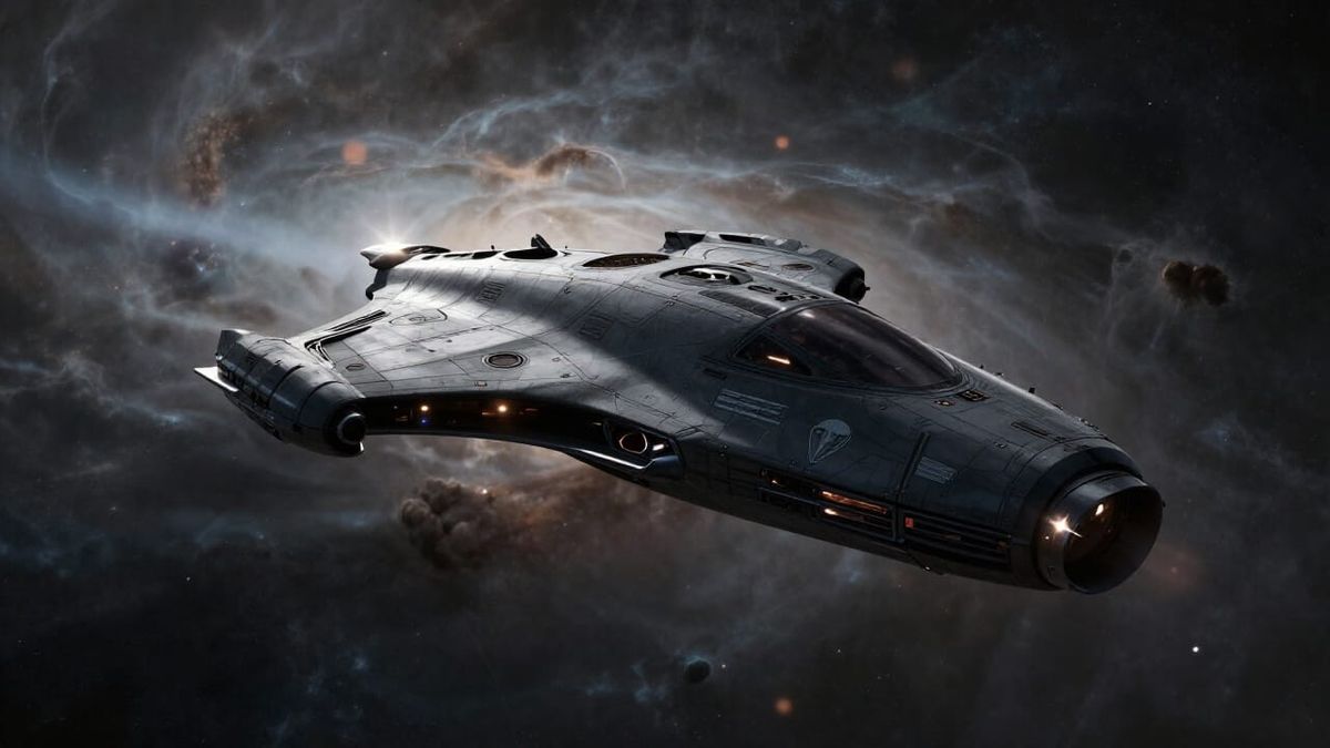 This image depicts a sleek, dark spaceship designed for espionage, gliding through a vibrant nebula. Dramatic lighting and lens flares enhance the cinematic, mysterious sci-fi aesthetic.