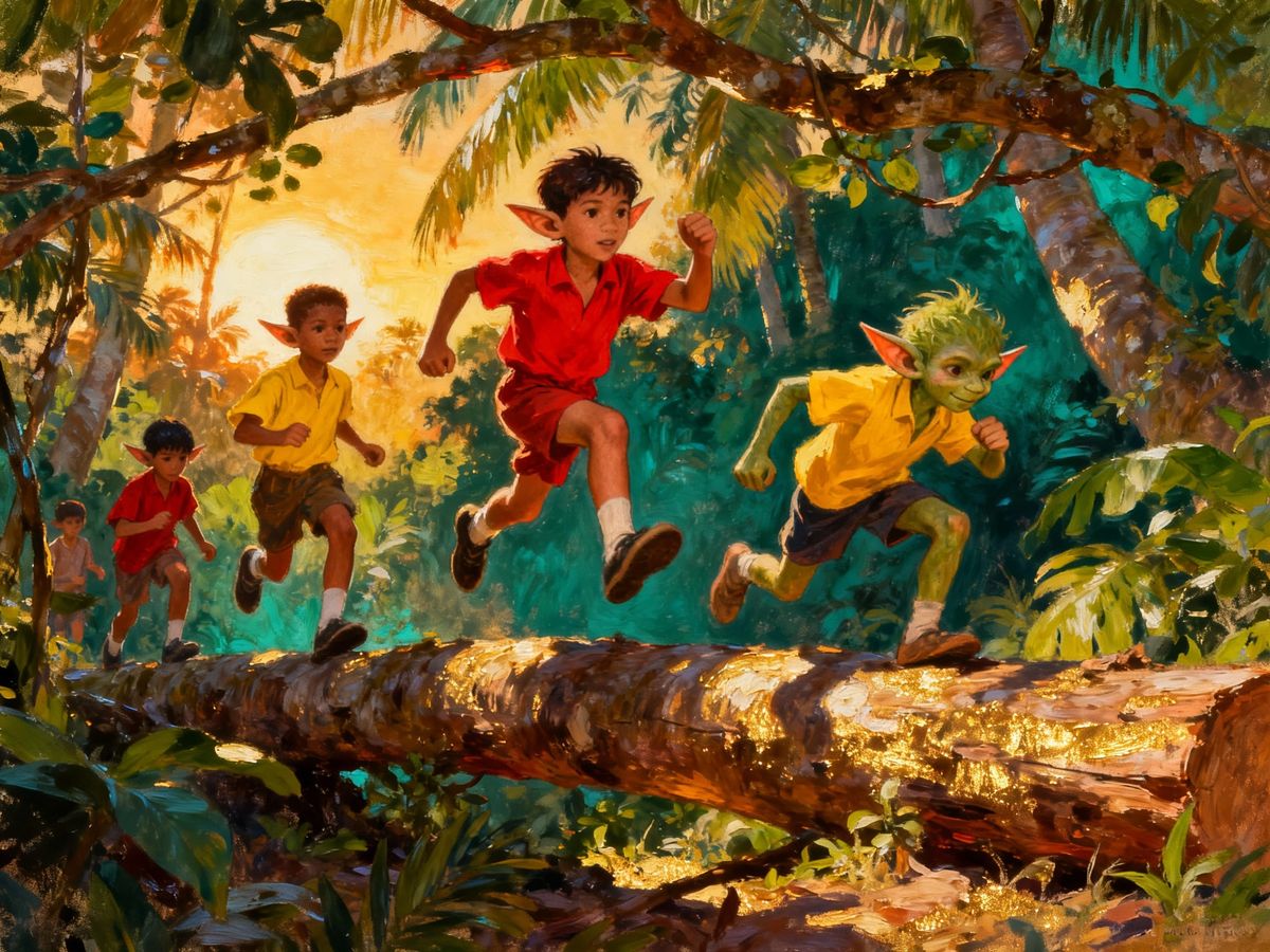 storytelling, color wash by Terry Bradshaw, illustration, storytelling, (dramatic angle, dynamic angle, dynamic poses, significantly different expressions from each other, global illumination, storytelling, tropical scene, glossy, waxy, Hawaiian jungle, jumping over logs and ducking under branches (detailed ...