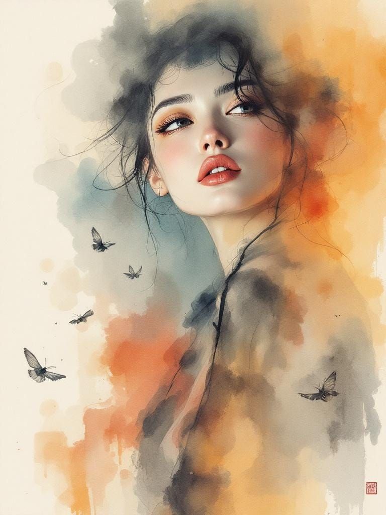 This image shows a 1950s pin-up woman making direct eye contact. Atmospheric watercolor washes and precise ink linework evoke a serene and contemplative aesthetic.